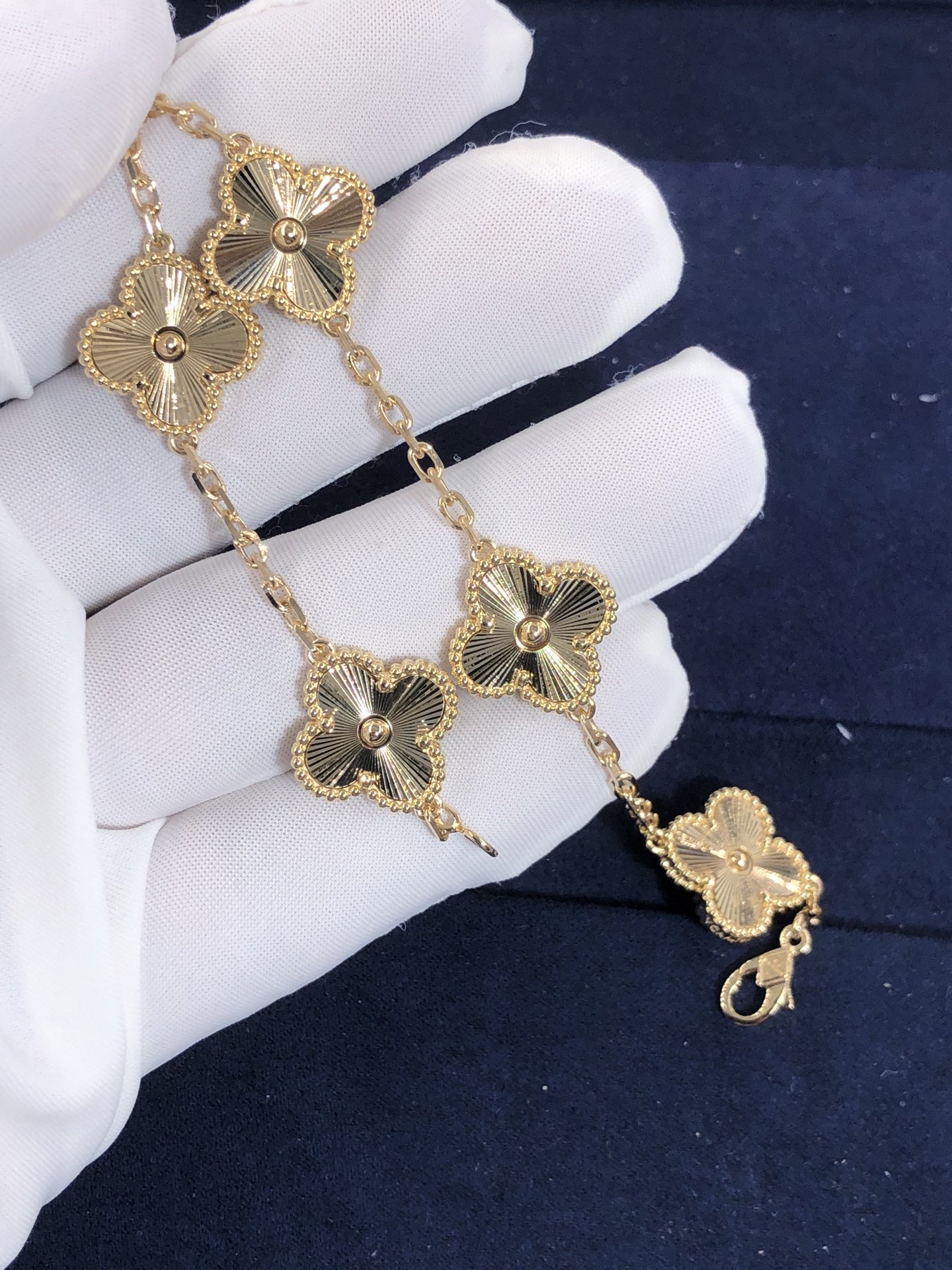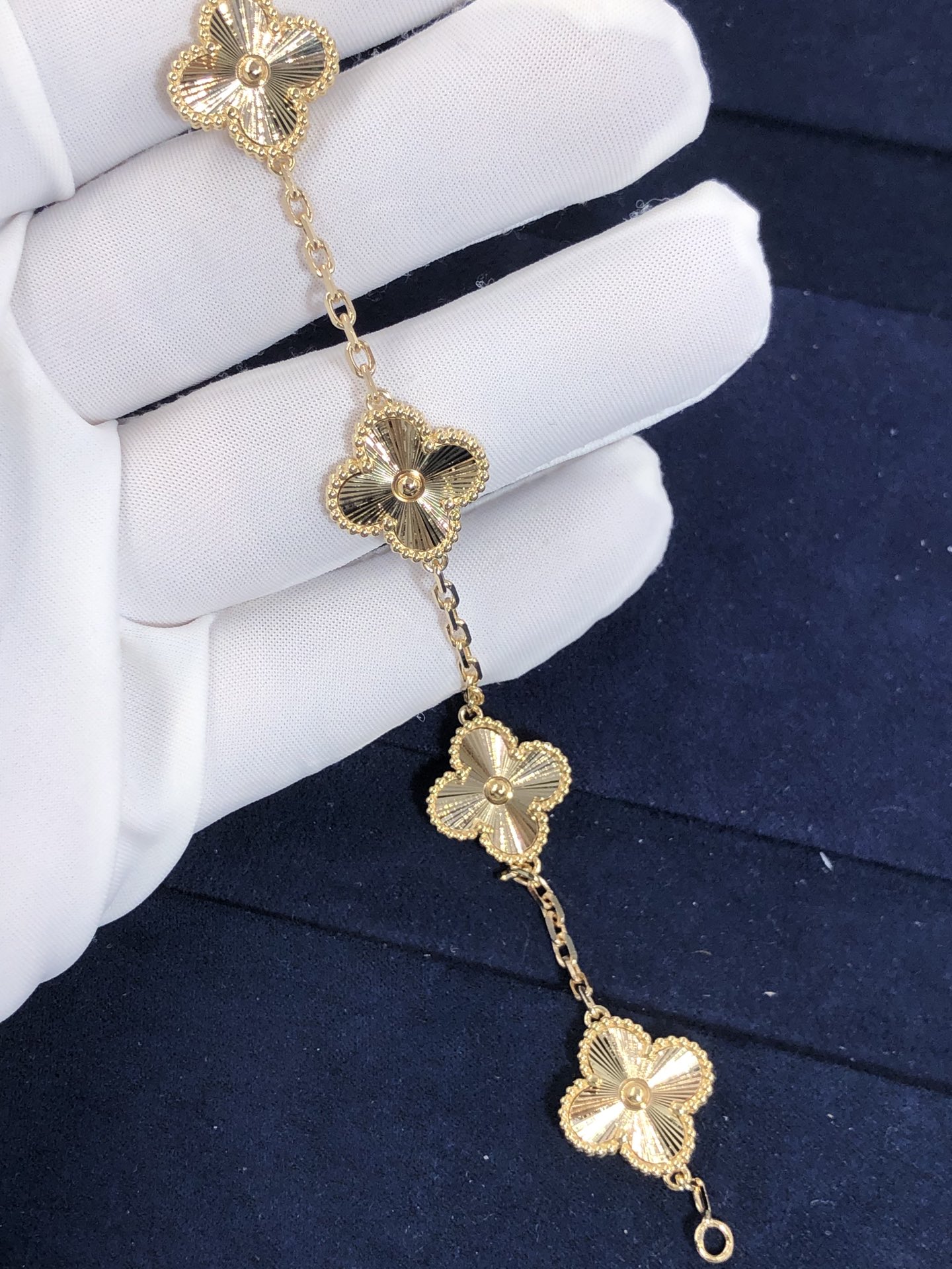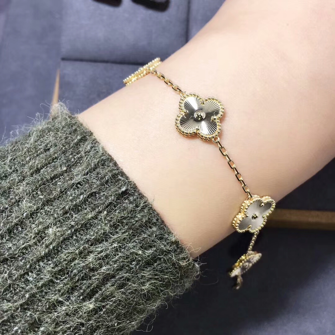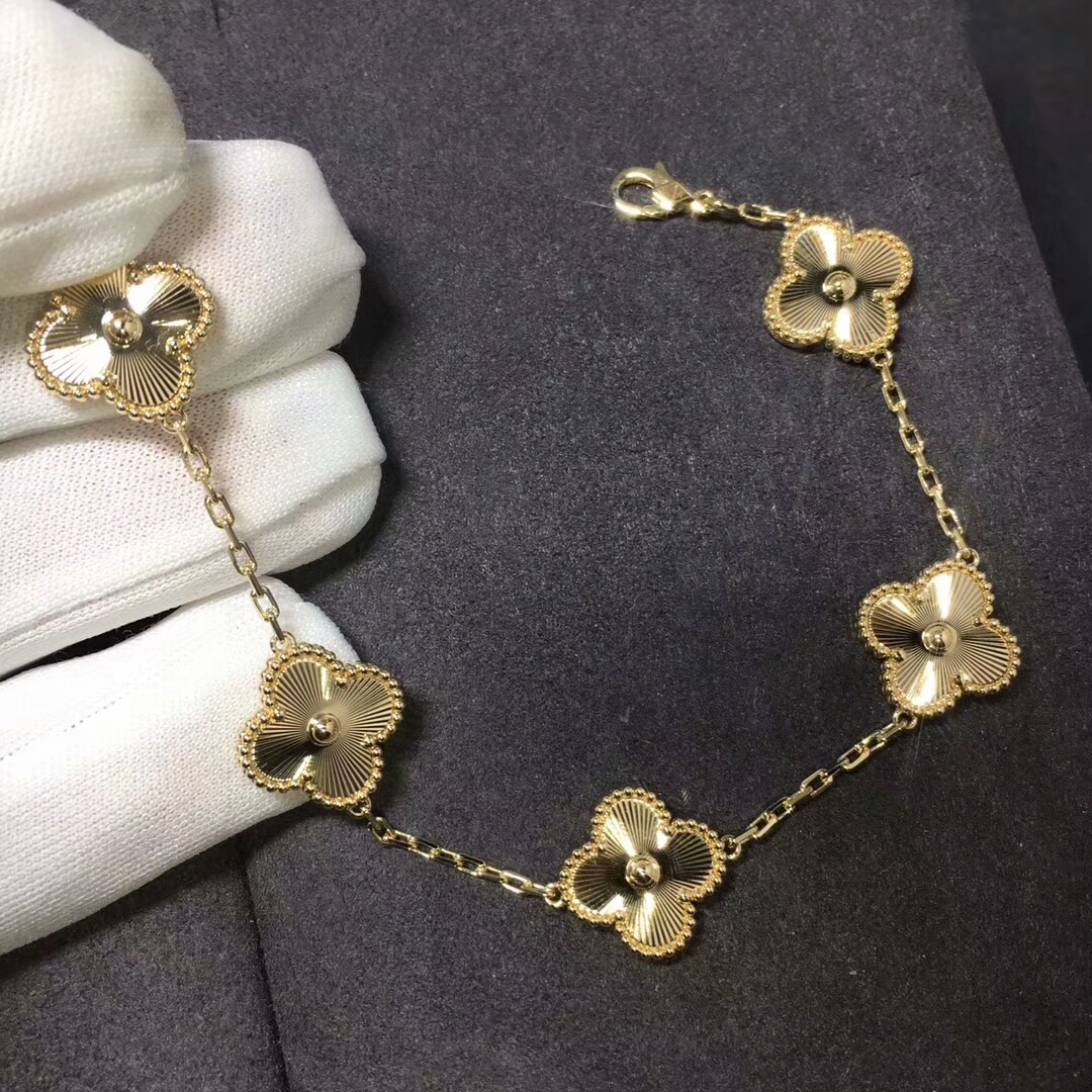 De cleef & bracelet arpels vintage alhambra serti de 5 motifs est en or jaune 18 carats.La taille du poignet est de 7,6 pouces,et la taille du motif est de 15 mm * 15mm Fidèle au tout premier bijou Alhambra créé en 1968, les créations vintage d'alhambra de Van Cleef & Les arpels se distinguent par leur, élégance intemporelle.
