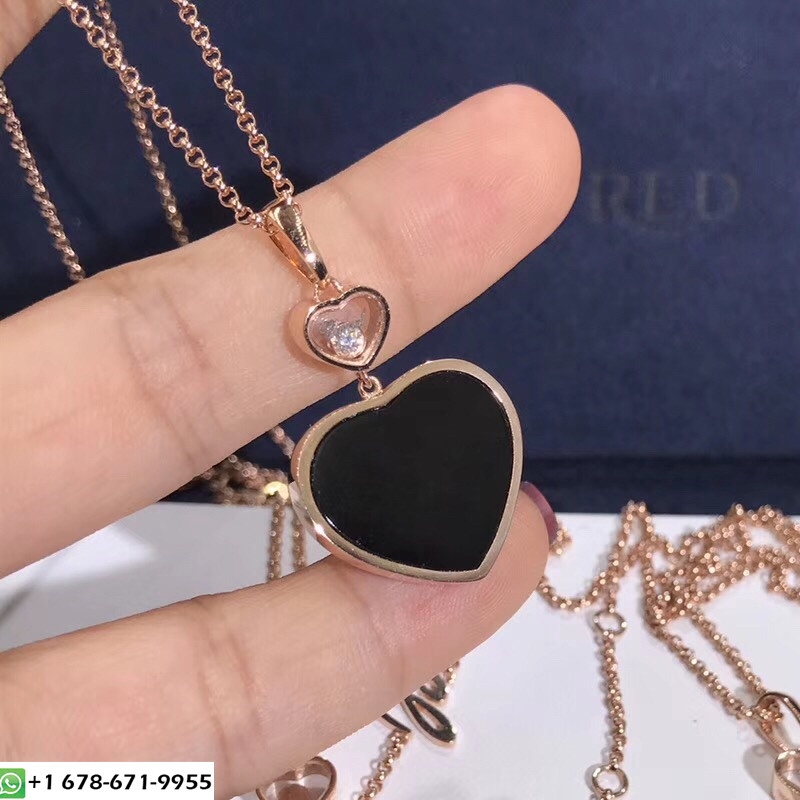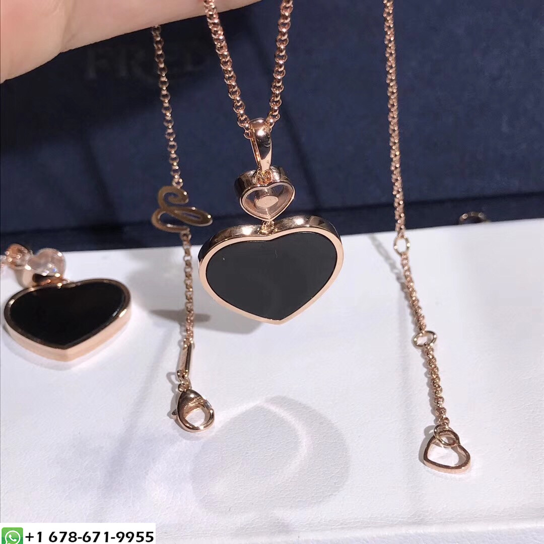 Chaud collier Chopard Happy Hearts fait sur mesure en or rose 18 carats avec un poids de diamant 0.05 ct et onyx. Longueur de la chaîne:45cm.